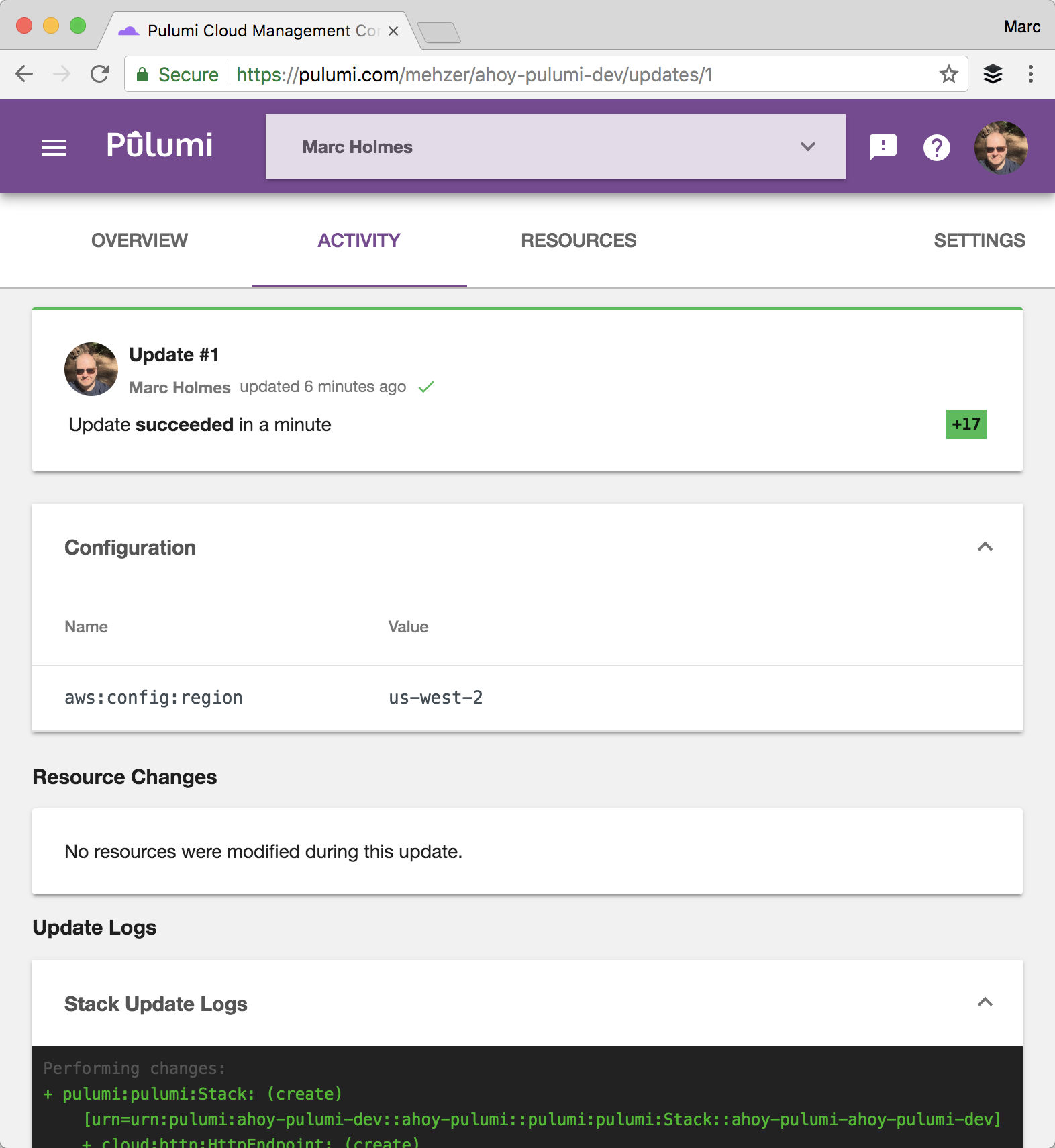 The output also contained a permalink to the Pulumi Console. Click on that link to review the stack in the web UI, examine logs and resource usage, and learn how you can invite friends and coworkers to collaborate on stacks.