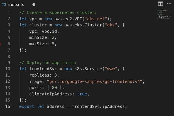 In this example, we use TypeScript to define a trivial app - an nginx image - and deploy 1 replica. Using a real language to define your app enables great IDE support — compile time checking for instance.