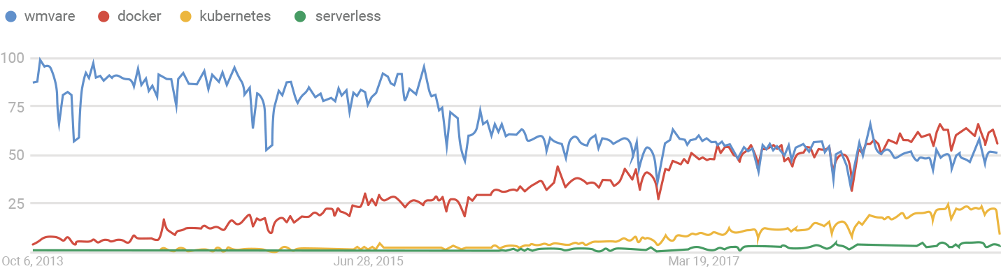 As usual, the future is unevenly distributed. A quick look at Google Trends over five years provides a reasonably clear picture of how embedded these evolutions are in the market at large. In this view, we use the presumed category incumbents to represent the market.