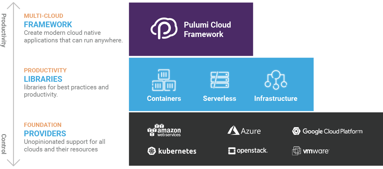 Pulumi brings the existing power of real programming languages to cloud native infrastructure and application delivery for huge productivity and collaboration gains.