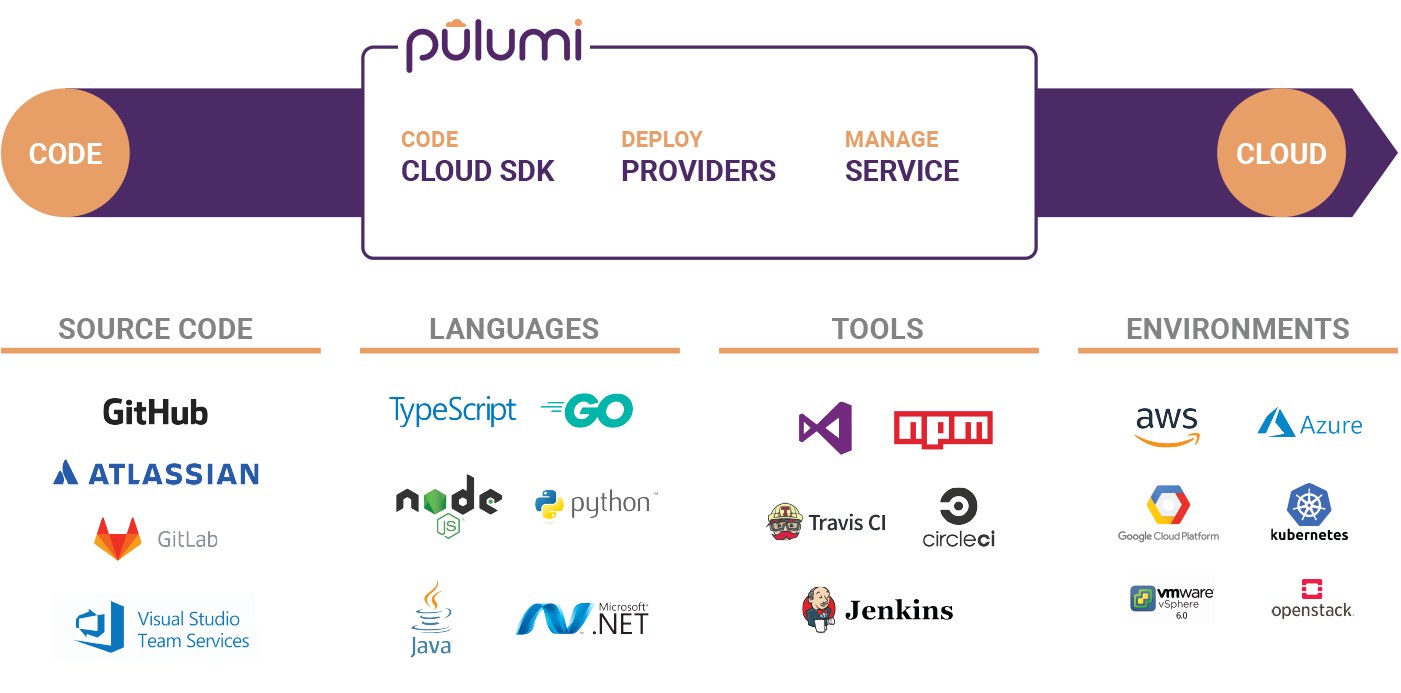 Pulumi provides a platform to deliver cloud native infrastructure as code for any technology, any cloud, and any language: